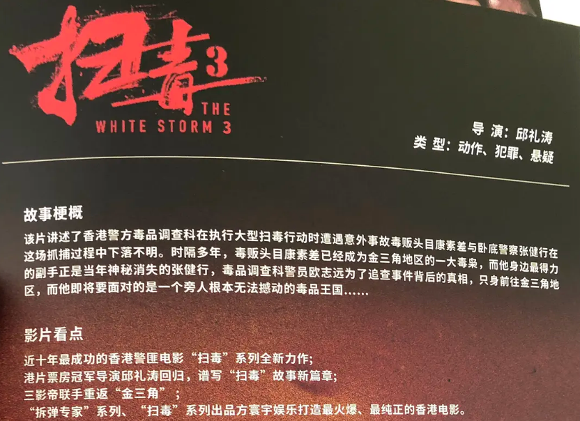 相比于“过度深刻的主题寓意”,观众们似乎更看重作品的动作场景、情绪铺垫。《拆弹专家2》、《怒火·重案》的票房大卖,也进一步证明了这一观点。 邱礼涛导演似乎也是看透了市场观众的心思,在这部《扫毒3》的剧本设计上,他学习陈木胜的《扫毒》,让故事回归到了“卧底警匪”、“兄弟情义”这两大创作主题之上。 在《扫毒3》 的故事里,“卧底警员”张建行在一次围捕行动中,与“毒枭”康素差一同失踪。多年后,康素差成为金三角最大的“毒枭”,而他的副手,正是失踪多年的张建行。“警员”欧志远奉命调查,一场警匪对决也随之拉开帷幕。 |