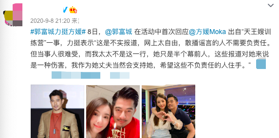 最近,方媛在采访中回应“天王嫂培训班”一事在网上引起热议。9月6日,郭富城发博力挺妻子,一个字回应网传谣言,实力护妻的举动获得不少人称赞。 |