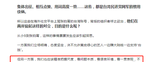 官媒指出,我们的立场是明确的,绝不允许“黄皮绿心”的艺人一边在大陆赚钱,一边搞TD。 “但另一方面,我们也应该精准把握尺度,看问题本质,看语言环境,看一贯表现,不能把人一闷棍打死,不能让靶向失准,否则就会上了别有用心的人试图挑动加剧对立的当。” |