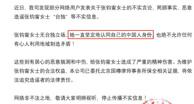 为了舆论进一步发酵,张钧甯工作室当即发布声明,明确否认自己是“TD”,她一直坚定认同自己的中国人身份,认为“两岸中国人都是中华民族的组成部分。” 对于散布谣言扰乱视听的不实消息,张钧甯工作室表示,将会依法追究造谣者的法律责任。 |