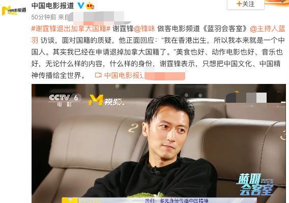 9月5日,谢霆锋在接受央视电影频道采访时,正面回应了国籍问题,自曝已经在申请退掉加拿大国籍,引起网友热议。 |
