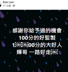 卫世辉的好友兼同事,TVB演员、主持人林盛斌(又名BOB)得知这一不幸的消息,在社交平台上发文悼念:“感谢你给予过的机会,100分制作人,100分的大好人,辉哥一路走好。” |