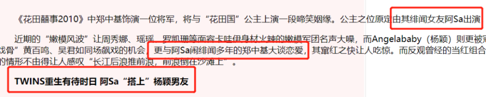 这儿有个插曲,同年在黄晓明被问到是否插足baby和陈伟霆感情时,说了句“我真的不知道他是谁。”导致陈伟霆被港媒嘲了3年强捧不红。 之后陈伟霆,baby,郑中基,阿Sa四人开始了cp乱炖。 2010年,baby和郑中基拍摄《花田囍事》期间曾传出绯闻,当时的通稿写得也很露骨,据说阿Sa就是因为这事才下定决心与郑中基离婚。 |