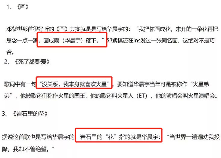 而在华晨宇爆出和张碧晨未婚生子事件后,就有爆料说他俩是因为张碧晨怀孕,被迫分手。 今年愚人节当天邓紫棋发了新歌,被指发布时间和歌词都在内涵华晨宇 |