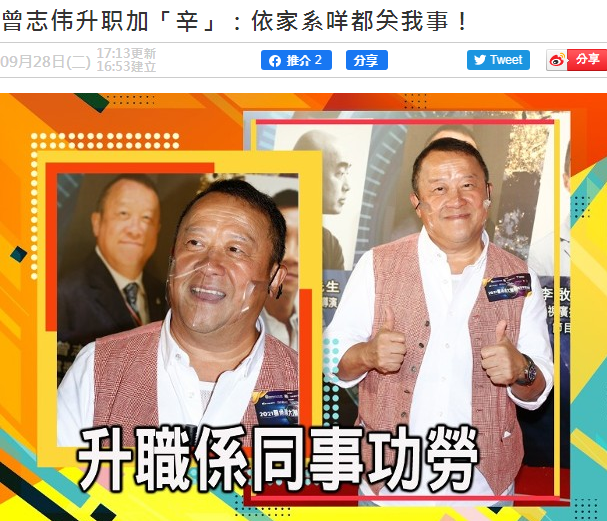 新官上任三把火,曾志伟没有“火”,反而笑容满面对属下的态度更加温和。 9月28日曾志伟“升官”之后首次公开露面,他神采奕奕笑容满面,一身休闲装站在西装革履的管理层中,穿衣方面有点鹤立鸡群的味道。 |