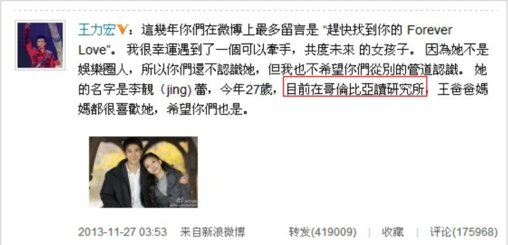 显然夫妻二人并非低调这么简单,其实从王力宏官宣恋情开始。就让李靓蕾感觉危机四伏,因为王力宏绝对是圈内官宣第一人。在公布恋情的时候,也是特意强调了女方学历。 |