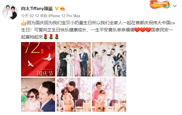 10月1日,国庆节,向佐郭碧婷之女小奶皇迎来1周岁生日。凌晨2点左右,身为奶奶的向太更新了个人社交账号,开心晒出庆生现场照为小孙女庆祝1岁生日。 向太激动发文写道:因为国庆因为我们宝贝小奶皇生日,所以我们全家人一起在首都庆祝伟大中国生日!可爱向芷生日快乐健康成长,一生平安喜乐,幸幸福福,国泰民安一起富裕起来! |
