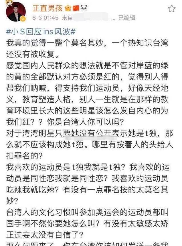 让我们先来回顾一下争议事件。奥运会期间,小S在外网频繁发文支持台湾选手,并在台湾羽毛球运动员戴资颖夺得银牌之后,发文:“虽败犹荣,但我差点暴毙。”还称其为“国手”。 |