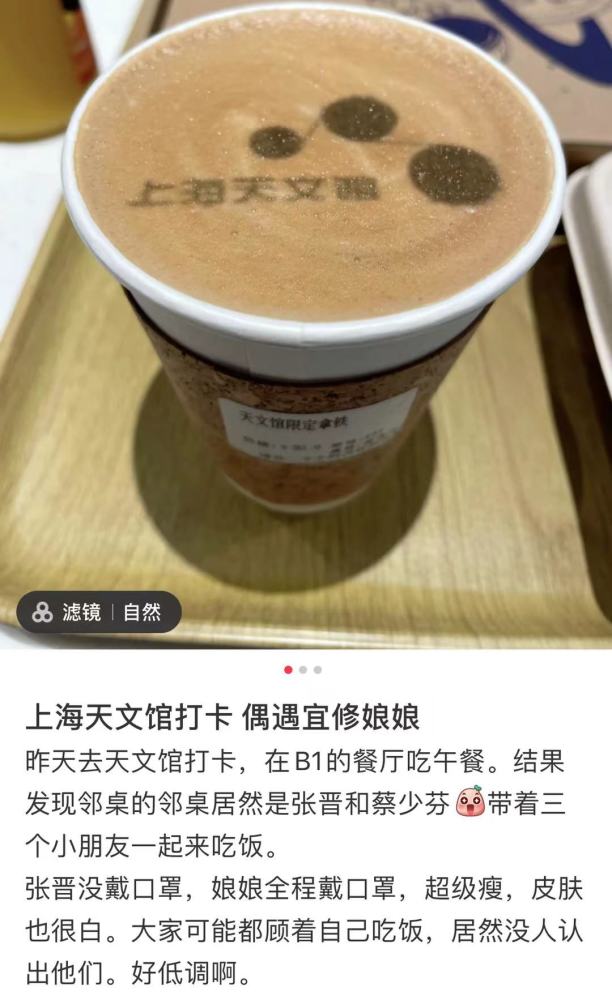 10月4号,网友在社交平台分享了蔡少芬一家五口用餐的偶遇照,据悉,网友是昨天偶遇他们的,只是今天才分享出来,偶遇的地点是上海天文馆,是旅游打卡的好地方,可见蔡少芬夫妇也跟大多数父母一样,趁着假期,带孩子们出来玩,来天文馆既长见识又长知识。 |