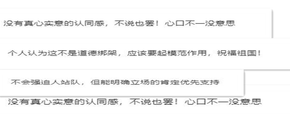 还有人说国庆节自己也没发朋友圈,也没把头像改成国旗,但自己很爱国。爱国是放在心里的,而不是说出来的。 甚至还有人说发言的人都是为了在大陆发展,在大陆赚钱,所以他们发言只是一种讨好的形式,而不是发自肺腑的。 |