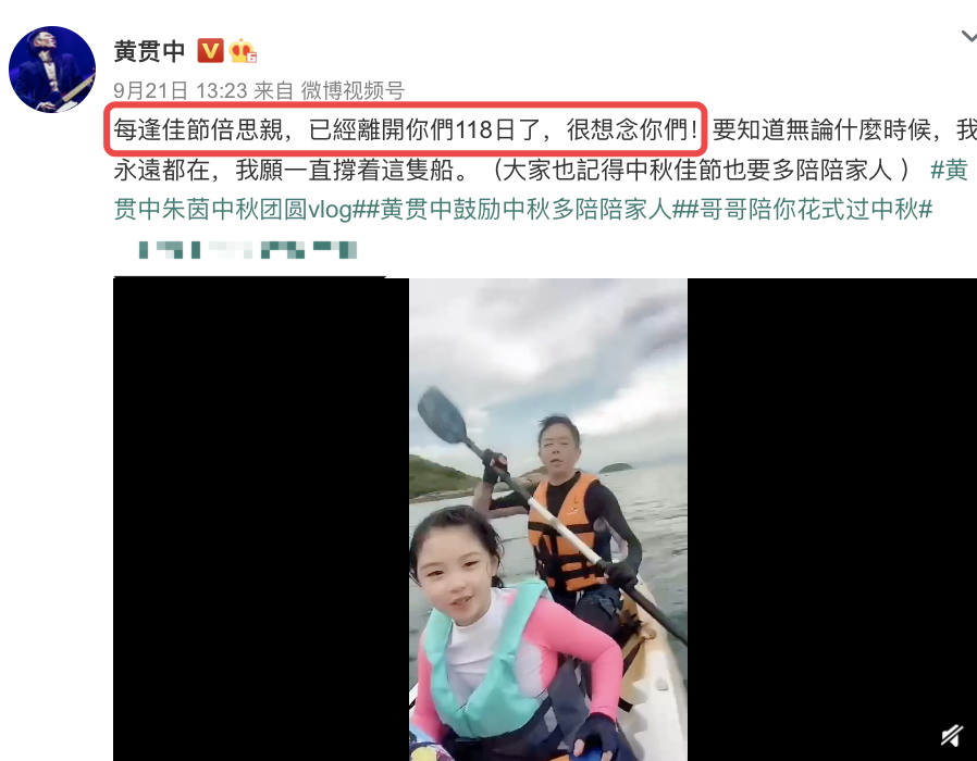 10月12日,黄贯中发文庆祝女儿9岁生日,感慨自己不能陪女儿身边很内疚,让女儿听妈妈的话,自己会尽快回家。 |