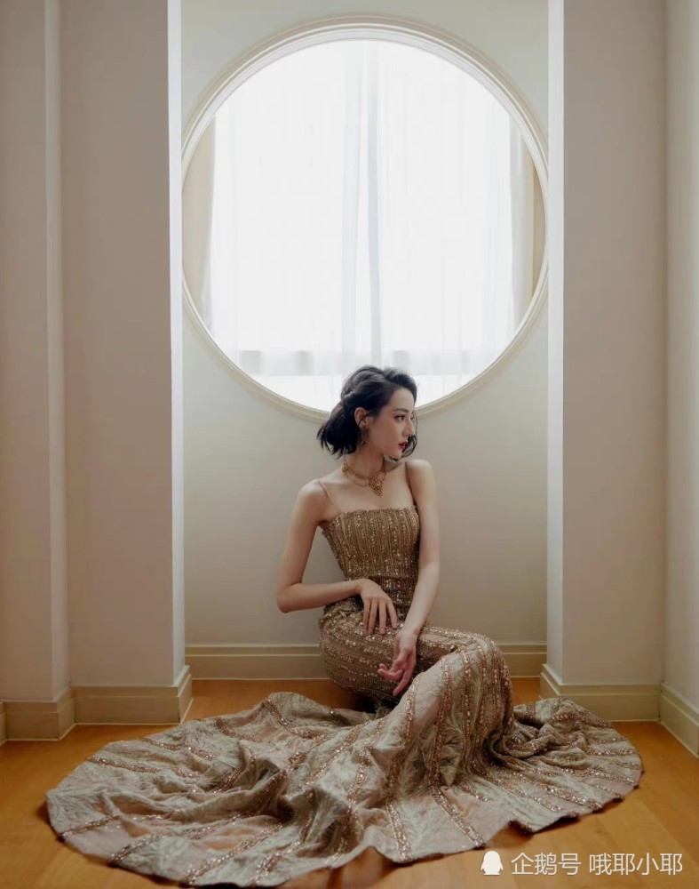 感觉热巴无论什么发型都能hold住,复古短发搭配鎏金吊带长裙尽显优雅气质。 |