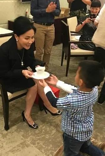 2015年,胡军儿子康康过7岁生日,香港“一姐”刘嘉玲直接送一套价值30万的纯金茶具给孩子当礼物,胡军看礼物贵重,当机立断地说:“刘姐,让康康做你干儿子如何!” |