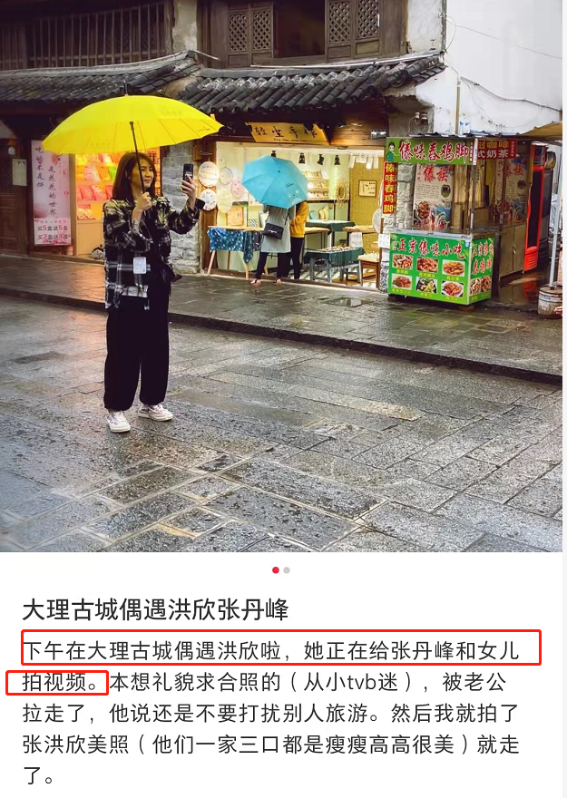 其实说张丹峰此次po出的是洪欣视角一点没瞎说,因为在16日的时候就有网友偶遇到了张丹峰一家三口出游的照片。虽然该网友当时仅仅只是晒出洪欣的美照,不过据她透露洪欣当时正在为老公、女儿拍视频,又因为怕打扰洪欣一家人的旅程,所以没有贸贸然上前求合影。 |