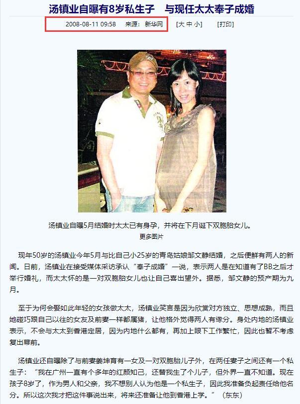 2008年,汤镇业自曝:“我在广州一直有一个认识多年的红颜知己,还替我生了个儿子,但外界一直不知道,现在孩子8岁了……” 按照孩子的年龄推算,在还没有与姜坤办理离婚手续的时候,汤镇业已经在内地忙于跟红颜知己造人了。 不过他也算是有担当,离婚后依旧负责三个子女的吃穿用度等一切费用,私生子也一直由他出资抚养。 |