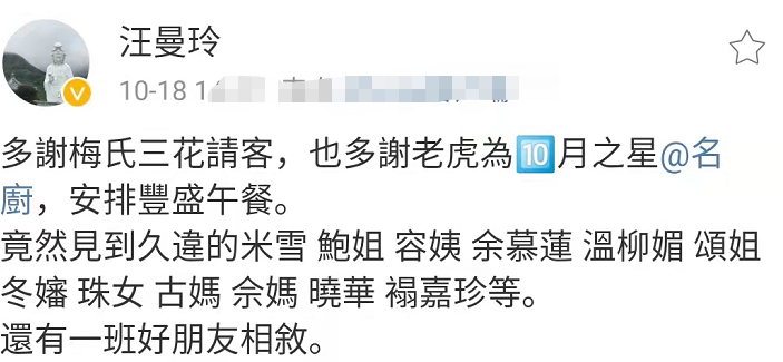 10月18日,某娱乐公司总监汪曼玲在社交平台上更新了一组与好友聚会的照片,引发网友热议。 |