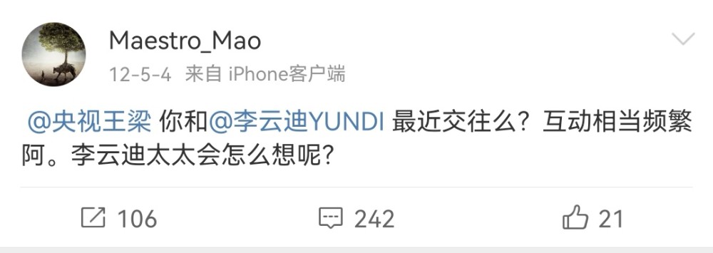 有没有妻子这件事还没搞清楚,李云迪又陷入了“出轨门”风波。 2013年3月,有报道称主持人王梁插足李云迪和华真的婚姻。 于是网友又开始掘地三尺,终于在华真小号中发现了端倪。 起因是一位名叫“Maestro_Mao”用户在微博上传了自己的自拍照,可能意识到自己忘记切号了,于是就火速删掉了。 |