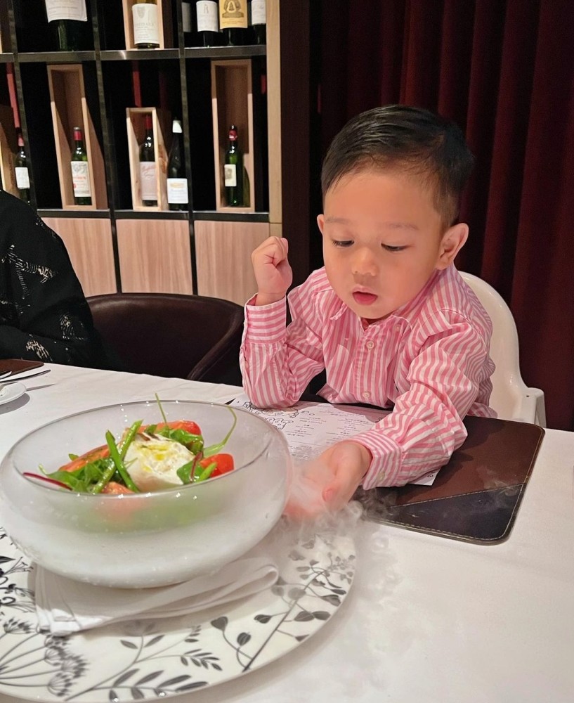 Brendan玩着餐桌上菜肴的冷气,满脸好奇心。 |