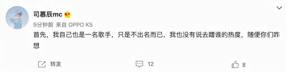 至于被怀疑蹭热度,司慕辰也表示自己只是一个不出名的歌手,没想蹭谁的热度。 |
