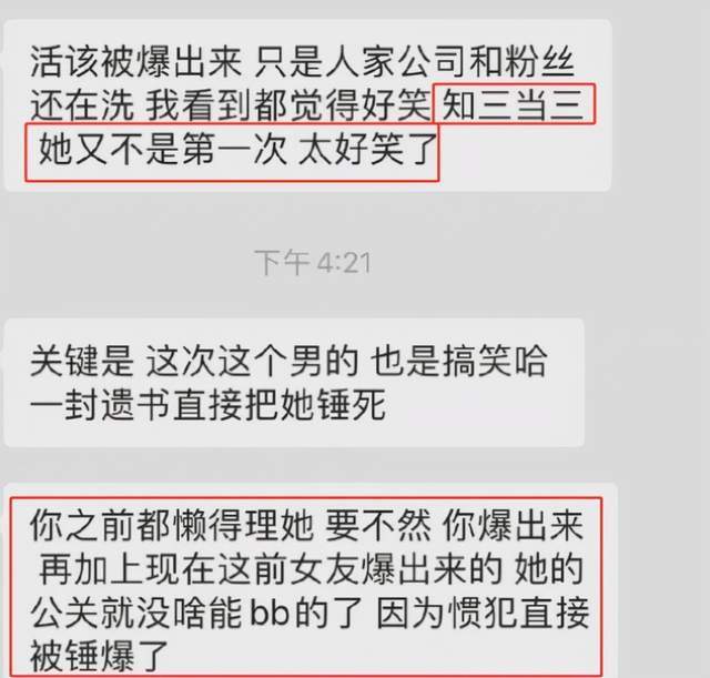 她还放出了两张聊天截图,都是粉丝私信她的内容,其中有一个人跟他说,“别人替你报仇了”另一个人说“活该被爆出来,毕竟她当上已经不是第一次了”从这些内容可以看出这位女星的发文其实是对这次事件的一个评价,而且她本人在谈恋爱的时候也被美岐插足过。 |