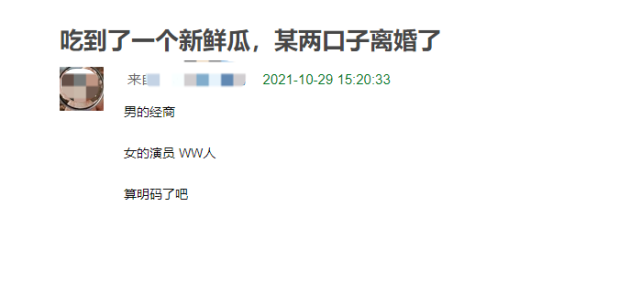 日前,有网友发帖爆料,称吃到了一个某两口子离婚的新鲜瓜,并且还透露了双方的个人信息提示,男方经商,女的演员WW人(宝岛人)。 网友觉得自己的提示很明显,还补充了一句“算明码了吧”。 |