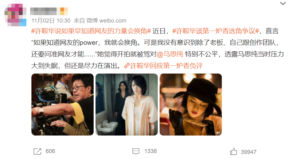 退圈10年再次复出,她用行动打脸看笑话的人。 前段时间,许鞍华自拆招牌拍出来的《第一炉香》总算上映了。 看完电影只有一个感受:如坐针毡、如芒刺背、如鲠在喉。 鉴于批评声太多,后来许鞍华不得不承认,选马思纯演葛薇龙就是一个错误。 |