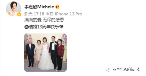 11月23日,李嘉欣在网上晒出自己13年前(2008年11月23日)在婚礼上和家人的大合影,庆祝自己结婚13周年,写道“满满的爱,无尽的感恩,祝结婚13周年快乐”—— |