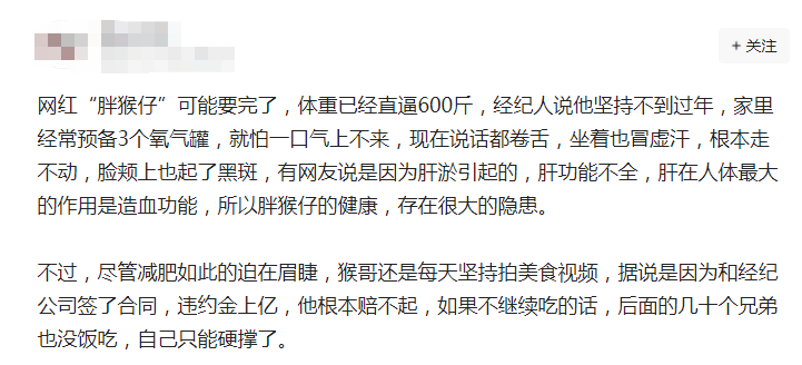 或许很多人会觉得,胖猴仔背后有团队在帮他宣传,不然一个接近600多斤的大胖子怎么会这么说,有这方面的原因不假,可更重要的是人家肯吃,每场直播、拍摄每个作品的时候,他都在认真的吃东西,靠着这份坚持和意志力才被人重视。 可因为常年吃这么多,导致胖猴仔的体重越来越胖,身体也不如从前好了。网上有人传出胖猴仔的经纪人专门发声,说了一下他的情况。 |