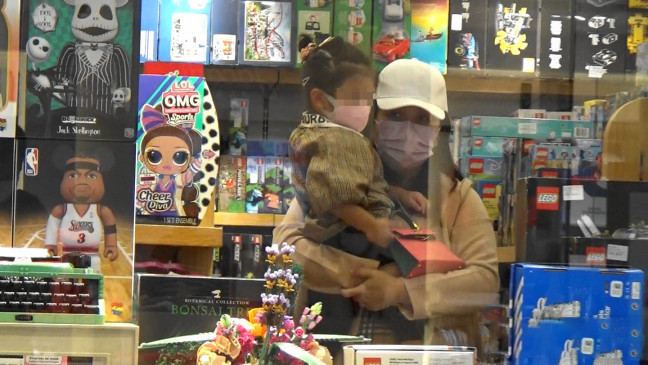 何超盈抱着女儿进了一间玩具店,然后把女儿放下来,牵着女儿双手蹦蹦跳跳,“童心未泯”看起来非常开心。 |