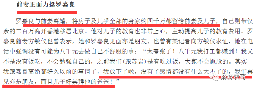 前妻也力挺罗嘉良,说太夸张了,自己不至于缺这8000块,打工也能赚到。 包括,外界一直有传罗嘉良离婚是净身出户,房子和财产都给了前妻。 |