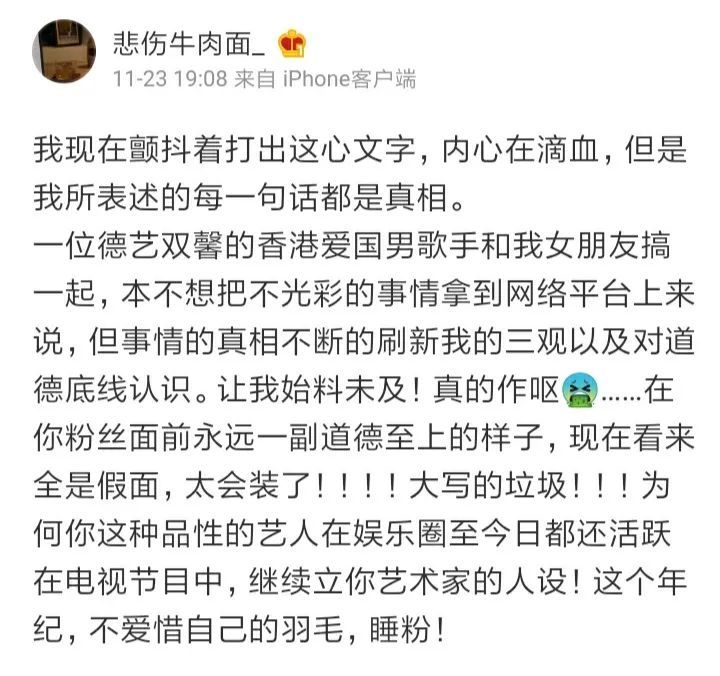 看到这里大家觉得谭校长能顺利躲过这一劫吗? 话说这事要从上个月23号晚上7点多说起,网友“悲伤牛肉面”在微博上爆料,称一个德艺双馨的男歌手绿了他,是大写的垃圾。 |