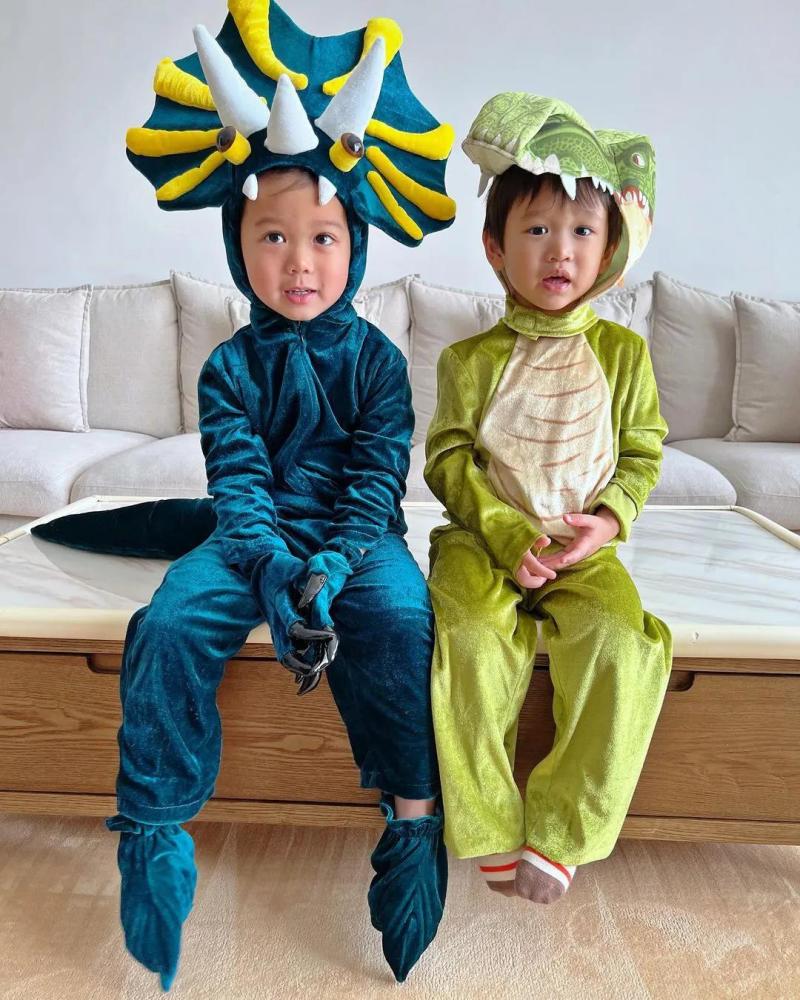 照片中,奕霆穿着蓝色恐龙装,头上的造型看起来特别夸张,从头到脚再到爪子,全副武装,感觉超酷的。奕霖穿着绿色恐龙装,造型虽然比较简单些,但模样十分可爱,跟奶萌的他简直超搭。 |