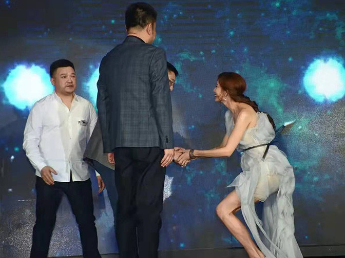 在这一组林志玲穿单肩装亮相的旧照中,有多张是林志玲和男嘉宾握手的照片,无论是和年纪大的男嘉宾合影还是和年纪小的男嘉宾合影,林志玲都采用了半蹲的姿势和他们合影,画风看上去确实有点挺奇怪的。 |