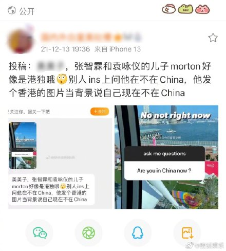 袁咏仪微博截图 近日,有网友在微博爆料称,香港艺人张智霖与袁咏仪儿子“魔童”(张慕童)“好像是港独”。原因是有人在社交媒体Ins上问他在不在中国,他发了个香港的图片当背景却说自己不在中国。 |