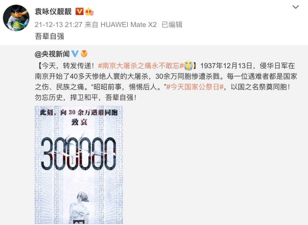 12月13日的国家公祭日,她也进行了转发,纪念30万无辜受害的祖国同胞,也以此来提醒粉丝们勿忘历史。 |
