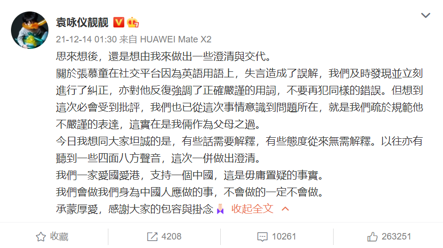 12月14日凌晨1点半,香港知名女演员袁咏仪突然通过微博公开道歉,为儿子张慕童在社交平台上用词不当一事做出解释,表示是因为英语用语上失言造成了误解,已经在第一时间进行了纠正,并教导其不要再犯同样的错误。 同时,她还代表老公张智霖一起表明了态度,说他们一家人绝对不会做一些不利于国家的事,希望大家能够包容和理解,像以前那样继续支持他们。 |