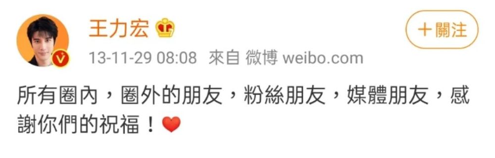 可能是原有的矛盾被现实因素与孩子不断地缓冲,但仍然走不到能把它完全解决的阶段吧。所以选在年末官宣离婚,虽然意外,但也不至于让人太震惊。 因为,王力宏和李靓蕾的这段婚姻,从开始就充满了唱衰的声音,居然能生三个娃、走过八年,本身已经很让人意外了。 13年11月27日凌晨,王力宏忽然扔下重磅炸弹公开恋情,他找到了“可以牵手、共度未来的女孩子”。对方是圈外素人,王力宏还贴心附上个人简介——哥伦比亚研究所在读李靓蕾。 |