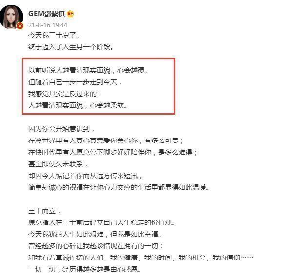 邓紫棋生日当天的发文,也是令人寻味,或许到了30岁后,看清楚的东西会更多,包括感情。 |
