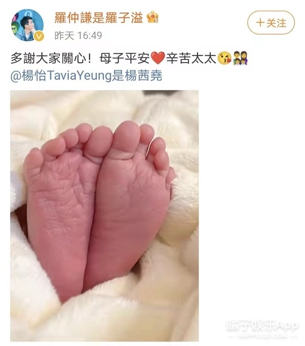 儿女双全,作为爸爸的罗子溢紧跟老婆也亲自发文官宣,他晒出二胎儿子的脚丫照,写道:“多谢大家关心!母子平安,辛苦太太。” |