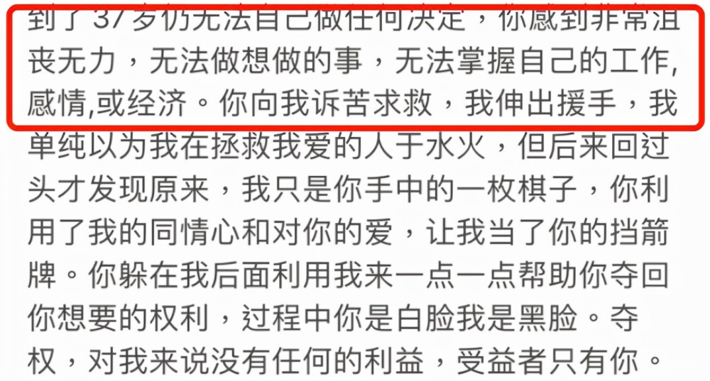 整个长文总结下来:李靓蕾为了爱情和王力宏结婚,为他5年生3个孩子,忍受他的冷暴力和各种混乱的男女关系,忍受自己在婚姻中除了,满足最基本的生活没有其他财产,唯一的要求是离婚官宣后,王力宏能处理好各种负面新闻,但他没做到,因为他说“不再回应”。 感觉5年的婚姻,就是一场骗局。 |