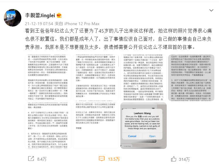 鞭牛士 12月19日消息,18日深夜,王力宏爸爸深夜发布王力宏父亲手写信,称李靓蕾靠胎儿逼婚上位;两人的离婚程序走了两年,女方要求数亿元台币生活费、要有菲佣保姆司机及孩子的生活费和教育费,王力宏都同意给了;李靓蕾的长文是分居两年处心积虑的结果;并声称王力宏没有出轨。 对此,李靚蕾发博回应称:“看到王爸爸年纪这么大了还要为了45岁的儿子出来说这样谎,拍这样的照片觉得很心痛也很不敢置信。我们都是成年人了,出了事情应该自己面对,自己做的事情由自己来负责承担。我原本是不想要提及太多,很遗憾需要公开谈论这么不堪回首的往事。” 李靓蕾在回应中指出:自2019年台北演唱会后王力宏开始用各种方式逼她离婚,二人开始协议让王力宏过他想过的单身生活,探索是不是能找到一个保全家庭生活的方式。最后,她表示要求王力宏下午3点前公开道歉,否则会立即寻求法律途径对王力宏及其父亲提出诽谤的告诉。 |