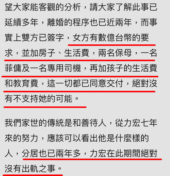 很显然,王力宏父亲这是在反驳李靓蕾。 因为之前李靓蕾发文时曾说,孩子的生日、重要的节日,王力宏经常缺席,不是一位称职的父亲。 王力宏的父亲还说,离婚时王力宏已经满足了李靓蕾的要求。 数亿台币,房子、保姆、司机、生活费等日常开销,王力宏全部支付。 至于儿子混乱的私生活,他予以否认,称“在分居的两年时间里,王力宏绝对没有出轨”。 |