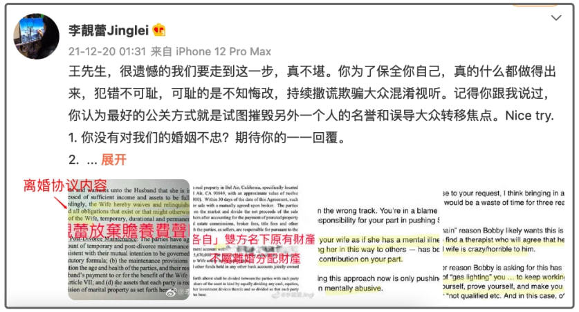 2021年只剩下10天了,这最后一个大瓜终于要落幕了啊~ 02 网友真的很可爱。 整个事件中,王力宏最生不逢时的便是遇到这届三观奇正的网友。 他们不崇洋媚外——外国人身份卖不动了; 他们不盲信公知——学霸家族身份卖不动; 他们不盲目追星——明星身份卖不动; 他们甚至还不盲目仇恨——引导仇日情绪也卖不动! 在王力宏出动“爸爸牌”和亲身上阵后,相较于王家父子远离中文环境的措辞,李靓蕾的发文不仅语句通畅,还有图有真相。 在王力宏发文后,而李靓蕾连发两篇文章,直接将证据发了出来。 |