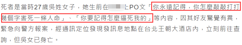 有媒体查阅资料后发现,在2016年10月27日台北市王朝大酒店内,的确发生了一桩蹊跷的命案。当时,一位穿着红衣的吴姓女子在酒店浴室里身亡,她生前在社交平台上发文自称是被某些人逼死的。 |