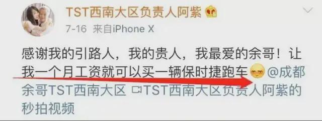 和其他微商努力几年喜提豪车不同,TST旗下的首席代理,自称自己一个月的工资就可以买保时捷。 |