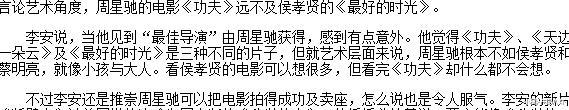 因为他们就如同“小孩与大人”一样,看了侯孝贤的电影可以想很多东西,但看完《功夫》之后就什么都不会去想,不过李安还是很服气的,因为周星驰可以把电影拍的成功又卖座 |