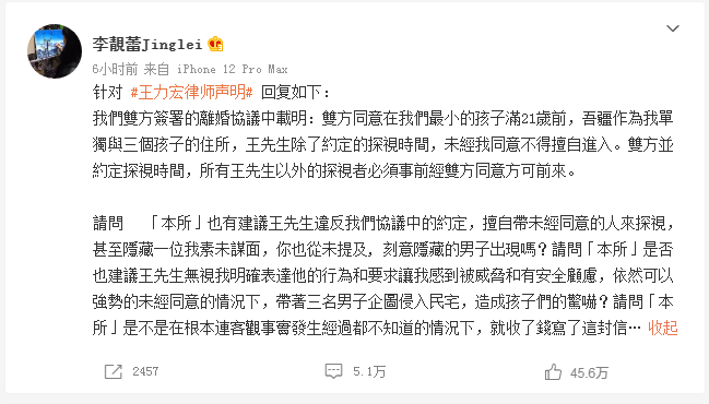 通过这一回合交锋,网友们大概能够看出王力宏带三位男士回家事件的来龙去脉。大概率是王力宏和律师“商量”的对策。至于为什么带另外三位男士回家看望自己的子女,有媒体曝光了其中缘由。原来是王力宏试图强行带走自己的三个孩子。 |