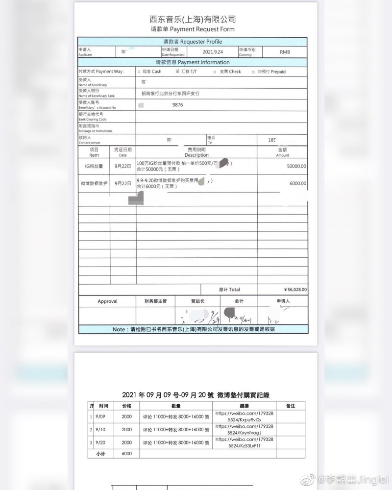 为了证明自己所言非虚,李靓蕾特地晒出一张请款单。 请款单上明确表明王力宏曾向上海某一公司支付了大量的资金,所涉及到的社交网包括微博和IG,从其价格来看,确实很高,评论达到1.1万,且转发8000加就可以领到2000元,由此不难看出平台监管的不利,一些网友的控评至今仍然存在。 |