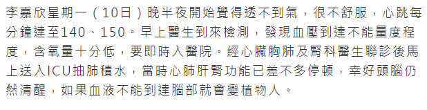 李嘉欣自曝突发大病入院抢救后,港媒也火速联系上了她询问具体的情况,据报道称,李嘉欣是在1月10日半夜感到不适,待到早上经过医生检查后发现她血压含氧量太低,已经无法量度,需立即入院抢救。 据医生透露,李嘉欣在ICU病房抢救时抽肺积水,心脏肝肾功能几乎停顿,差点变成植物人。 可见当时的情况有多么危险! |