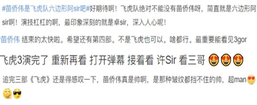 有人看飞虎系列完全是冲着苗侨伟去的,有人觉得苗侨伟是该系列不可替代的演员,《飞虎之壮志英雄》中他饰演的许俊飞上线时,弹幕瞬间沸腾。 |